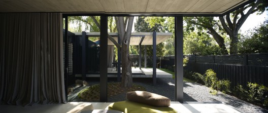 The two mature Elm and Willow became the constraints to the project. They informed the arrangement of our new addition, and together with passive solar orientation the result is a U-shaped plan enclosing a north-facing courtyard.